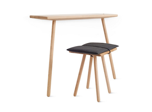 This console shelf has a few tricks up its sleeve. Three interconnecting parts allow you to change its function slightly. An angled surface fitted on top of the base has a parapet edge can hold hangers or other necessary items in place, or use the level surface piece for more stable items. Each section is all made from the same piece of wood to minimize waste.